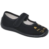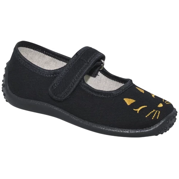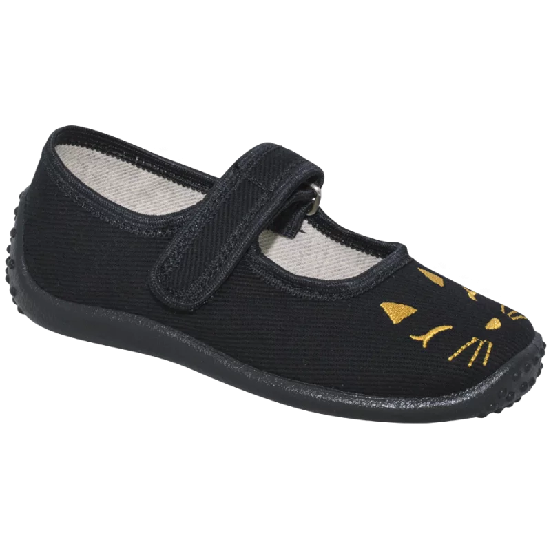 Obuwie dziewczęce wykonane z bawełny w czarnym kolorze zapinane na rzepa ozdobione złotym haftem.