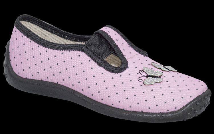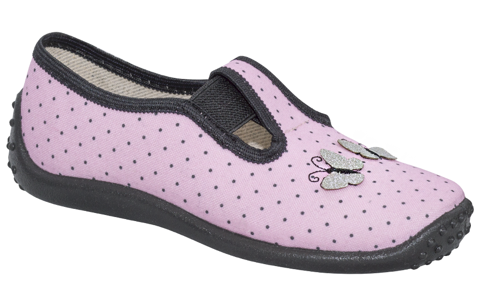 Obuwie dziewczęce wykonane z bawełny wsuwane ozdobione srebrnymi motylkami.