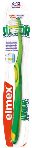 Szczoteczka do zębów elmex JUNIOR z włóknami ułożonymi w kształt litery X została opracowana, by ułatwiać szczotkowanie w okresie wymiany zębów mlecznych na stałe.