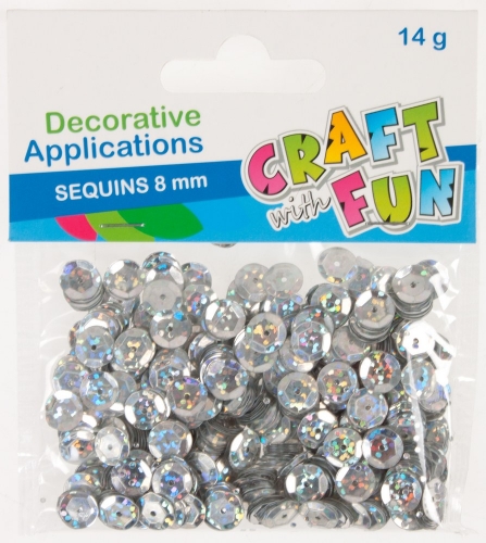 Opakowanie zawiera metaliczne, okrągłe, srebrne cekiny o średnicy 8 mm.