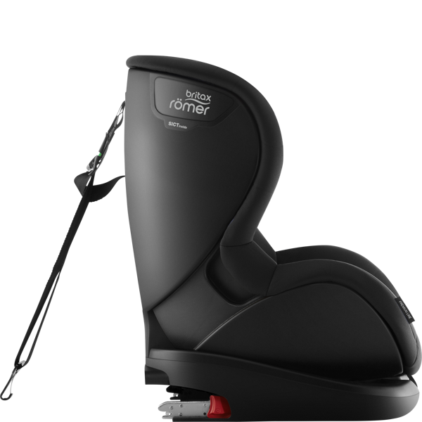Top Tether z technologią rip-stitch, w kształcie litery V uniemożliwia obracanie fotelika oraz redukuje ruch dziecka do przodu w przypadku kolizji.
