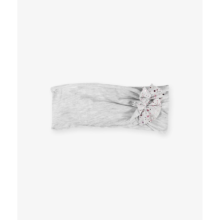 Opaska bawełniana dziewczęca w kolorze popielatym z ozdobną aplikacją. Opaska ma 44 cm.