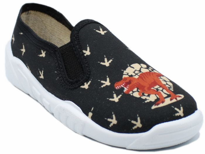 Obuwie chłopięce polskiej firmy Zetpol, z przodu dinozaur. Wnętrze buta wykonane z bawełny, a podeszwa z bardzo elastycznego bezftalanowego tworzywa w białym kolorze. Zapięcie: guma. Wkładka: skórzana profilowana. Produkt polski.