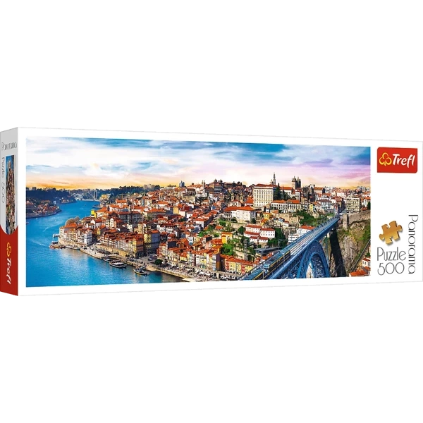 Puzzle panoramiczne składające się z 500 elementów przedstawiające widok na piękne miasto Porto w Portugalii. Po ułożeniu powstanie obrazek o wymiarach 660x237mm. Produkt został wykonany z wysokiej jakości materiałów, z zastosowaniem specjalnego kalandrowanego papieru odbijającego światło, co ułatwia układanie. Produkt został wyprodukowany w Polsce, a do produkcji zostały użyte materiały ekologiczne.
