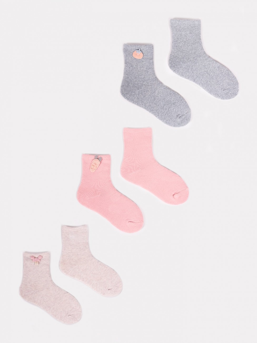 Dziecięce skarpety dostępne w praktycznym trzypaku. W stonowanych, dziewczęcych kolorach, z ozdobą w postaci elementu 3D.