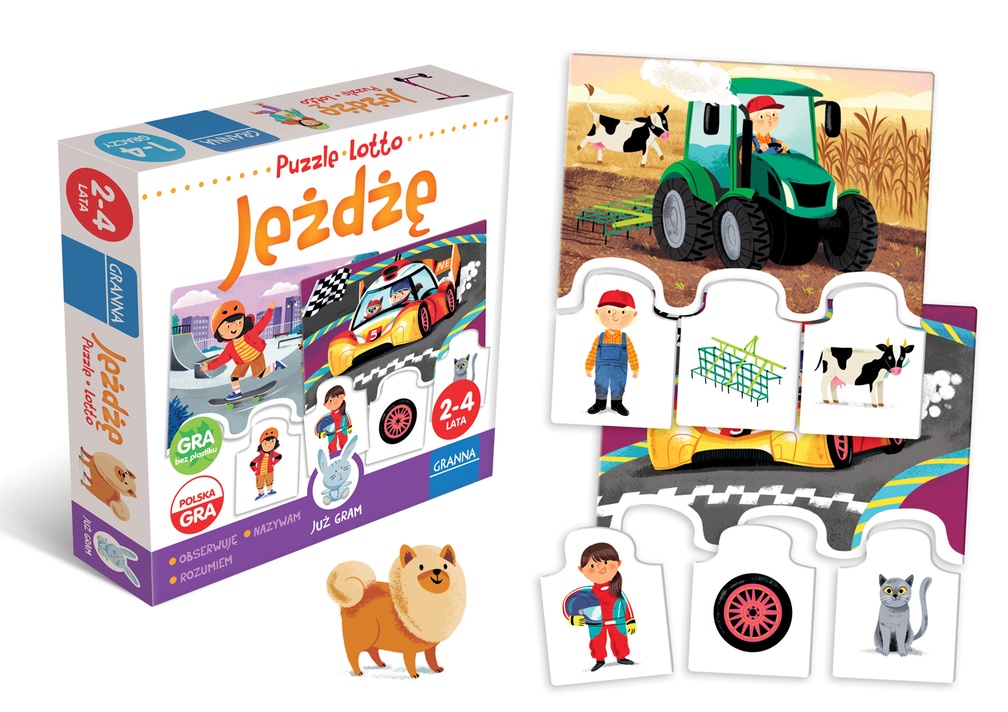 Jeżdżę. Puzzle lotto z serii Już gram to rozwijająca spostrzegawczość, wciągająca zabawa dla dzieci między 2 a 4 rokiem życia.