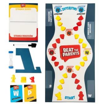 Stań do walki w bitwie o dominację w rodzinie w grze Beat the Parents! To pełna zabawy rodzinna gra z ciekawostkami. Udowodnij, kto jest szefem, dzięki sprytowi i umiejętnościom. Rodzice będą musieli odpowiedzieć na pytania dotyczące dziecięcych spraw. Dzieci zmierzą się z pytaniami, na które odpowiedzi powinni znać rodzice. Oba zespoły, poruszając się po planszy, będą musiały dodatkowo zmierzyć się z szalonymi wyzwaniami! Konkurencja będzie coraz ostrzejsza, gdy obie drużyny zaczną wymieniać smaki lodów, zaczną budować i latać papierowymi samolotami czy staną do pojedynku na spojrzenia. Pierwsza drużyna, której pionek dotrze na drugi koniec planszy, wygrywa! Przygotuj się na ostateczny pojedynek rodzice kontra dzieci w grze Beat the Parents!