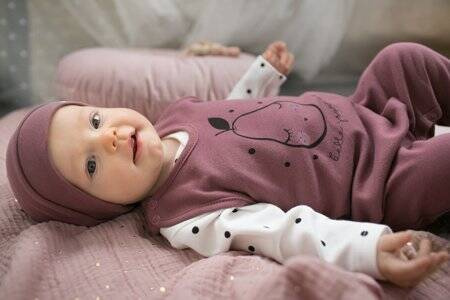 Różowa, jednowarstwowa czapeczka niemowlęca z kolekcji Tres Bien z uroczą kokardką zawiązaną na szczycie czapeczki. Po lewej stronie czapeczki umieściliśmy naszywkę w kolorze écru z czarnym kotkiem, charakterystycznym dla całej kolekcji Tres Bien. Nasza czapka jest elastyczna, a dzięki plisce dobrze przylega do małej, dziecięcej główki, zapewniając ochronę uszu przed wiatrem podczas spacerów. Sprawdzi się również jako czapeczka kąpielowa. Czapeczka jest wyprodukowana w Polsce i ma certyfikat „Bezpieczny dla dziecka”.