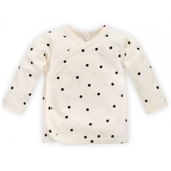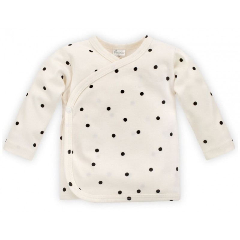 Wygodny wiązany kaftanik w kolorze ecru. Zdobiony nadrukiem z modne kropeczki. Pochodzi z kolekcji Tres Bien firmy Pinokio. Kopertowy krój ułatwia przebranie dziecka.