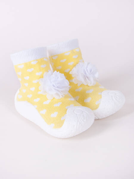 Skarpetobuty to skarpety z gumową podeszwą. Idealne dla dzieci, które stawiają pierwsze, niepewne kroki, ponieważ zapewniają dobrą przyczepność stopy do podłoża. Dzięki temu Twoje dziecko będzie mogło bezpiecznie poruszać się nawet po śliskich powierzchniach. Dodatkowo gumowa podeszwa doskonale chroni stopę przed wychłodzeniem. Model dziewczęcy w kolorze żółtym w białe serduszka z małym białym kwiatkiem z przodu.