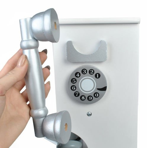 Drewniany telefon został umieszczony na bocznej stronie szafki, aby umożliwić maluszkom kontakt z przyjaciółmi.