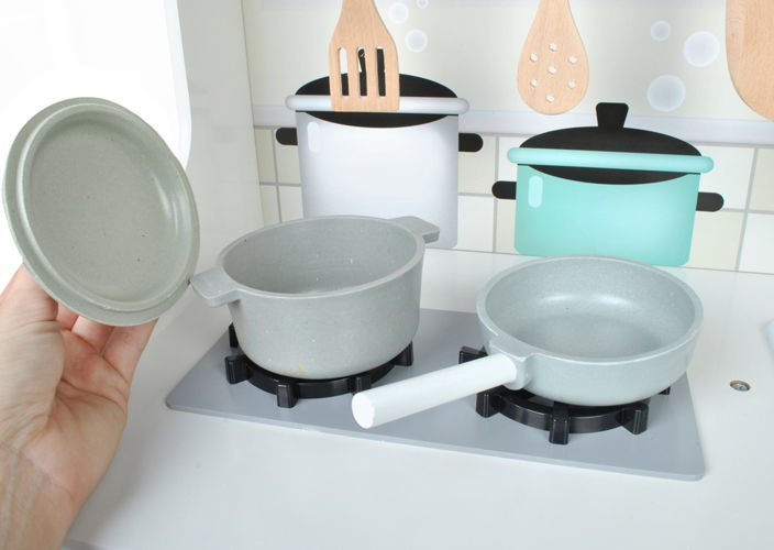 W zestawie znajdują się 2 garnki oraz drewniane akcesoria: 3 łyżki i nożyk. Akcesoria będą niezbędne do przygotowania jedzenia.