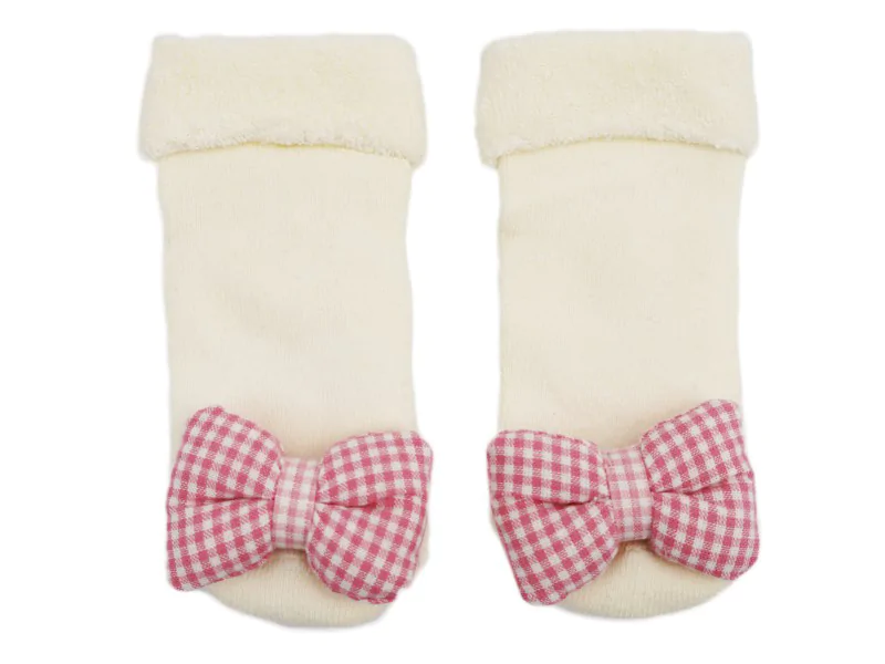 Skarpety frotte z ozdobną kokardą dla małego dziecka to doskonały pomysł na prezent. Skarpetki łączą elementy użyteczności i funkcjonalności - są zarówno ciepłe jak i zachęcają dziecko do zabawy, a doszyta maskotka w kształcie kokardy pomaga rozwijać zmysły wzroku i dotyku maluszka. Każdy maluch z pewnością pokocha skarpetki z kokardą.