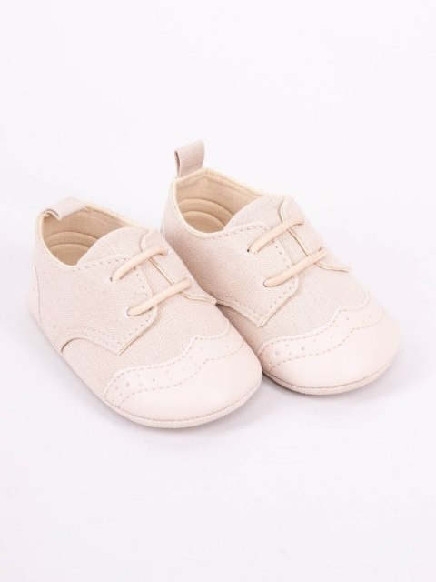 Śliczne chłopięce buciki w kolorze jasnobeżowym. Wykonane z połączenia dwóch różnych materiałów, dzięki czemu posiadają niebanalny, a zarazem elegancki wygląd. Idealnie sprawdzą się zarówno do codziennych stylizacji, jak i podczas wszelkich uroczystości czy sesji zdjęciowych.