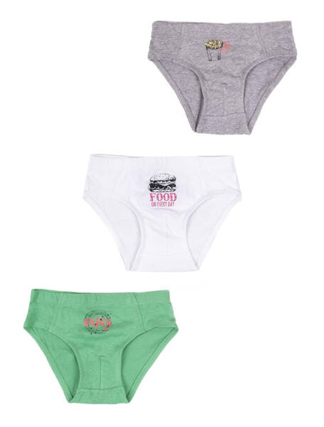 Chłopięce slipy dostępne w trójpaku, zapakowane w eleganckie pudełko. W wesołych kolorach, z motywem jedzonka. W pasie znajduje się szeroka i delikatna gumka, która sprawia, iż majteczki pozostają w miejscu, nie podrażniając skóry dziecka. Dodatkowo są delikatnie opinające, dzięki temu każdy większy chłopiec będzie czuł się w nich komfortowo.