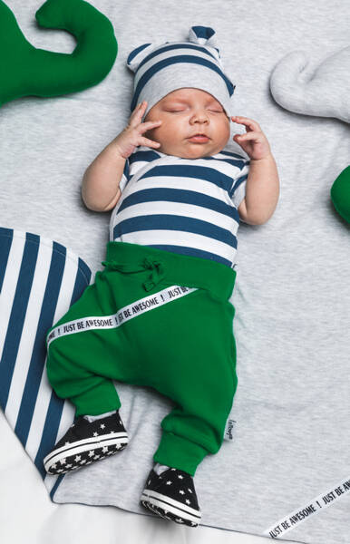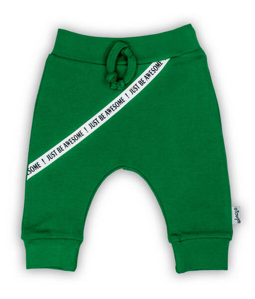 Modne spodnie dla chłopca wykonane z bawełny w kolorze zielonym, która jest całkowicie bezpieczna dla skóry dziecka. Spodnie posiadają ściągacz w pasie oraz przy nogawkach. Produkt zdobią sznureczki w pasie oraz biała taśma wszyta na jednej z nogawek z napisem " just be awesome". Fason charakteryzuje lekko obniżony stan by pomieścić pieluszkę.