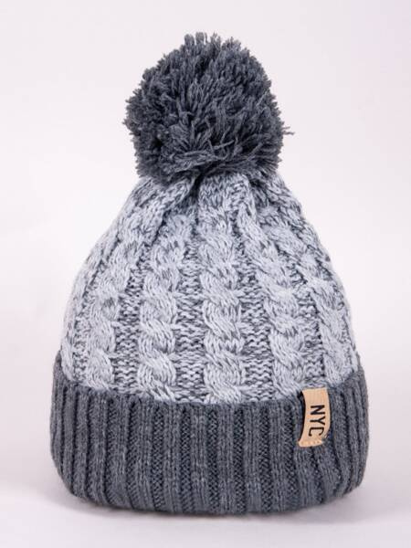 Zimowa czapka dla chłopca w kolorze szarym. O grubszym, warkoczowym splocie. Na górze znajduje się milutki pompon z frędzli. Zakończona ściągaczowym wywinięciem, na którym widnieje naszywka z napisem: NYC. W środku posiada bawełnianą podszewkę.