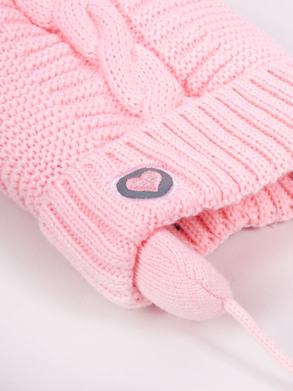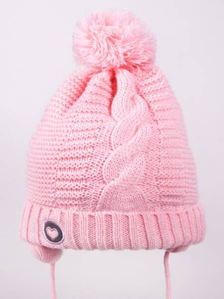 Zimowa czapka dla dziewczynki w kolorze różowym. Na górze znajduje się miły pompon z frędzli. Zakończona wywinięciem ze splotu ściągaczowego, na którym widnieje wyhaftowane serce. Trzywarstwowa – w środku posiada ocieplenie oraz bawełnianą podszewkę.