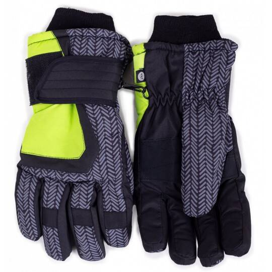 Narciarskie rękawiczki chłopięce w kolorze czarno – szarym w jodełkowy wzór. Na zewnętrznej stronie wstawka w kolorze neonowej zieleni. Wnętrze rękawiczki wykończone miłym polarem.Na nadgarstku zapinane na rzep, na górze zakończone dzianinowym ściągaczem, który zabezpiecza przed dostaniem się śniegu pod rękawiczkę. Na kciuku i wewnętrznej stronie dłoni posiadają dodatkową warstwę antypoślizgową ułatwiającą chwytanie.Rękawiczki narciarskie to obowiązkowe wyposażenie każdego miłośnika zimowego szaleństwa. Zapewniają dłoniom ciepło i suchość. Doskonałe do jazdy na nartach, snowboardzie czy sankach.