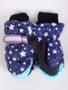 Narciarskie rękawiczki dziewczęce w kolorze granatowym, ozdobione niebiesko – różowymi gwiazdkami. Wnętrze rękawiczki wykończone miłym polarem.