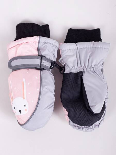 Narciarskie rękawiczki dziewczęce w kolorze różowo – szarym z motywem słodkiego króliczka. Wnętrze rękawiczki wykończone miłym polarem.
