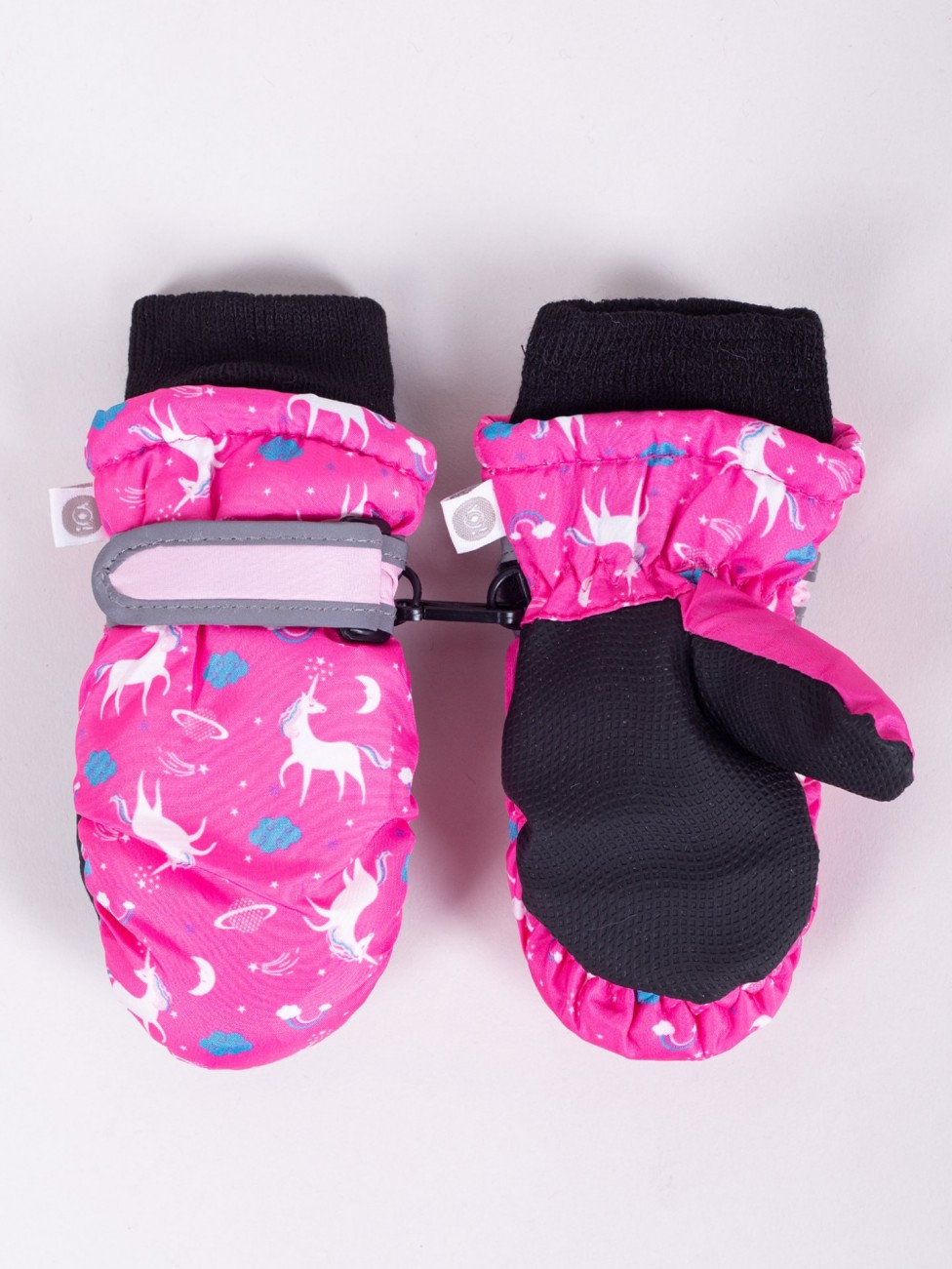 Narciarskie rękawiczki dziewczęce w kolorze różowym z motywem jednorożcy. Wnętrze rękawiczki wykończone miłym polarem.