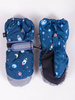 Narciarskie rękawiczki chłopięce w kolorze granatowo – szarym z motywem kosmosu. Wnętrze rękawiczki wykończone miłym polarem.