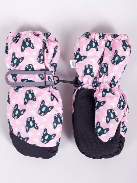 Narciarskie rękawiczki dziewczęce w kolorze różowo – czarnym z motywem buldożków. Wnętrze rękawiczki wykończone miłym polarem.