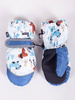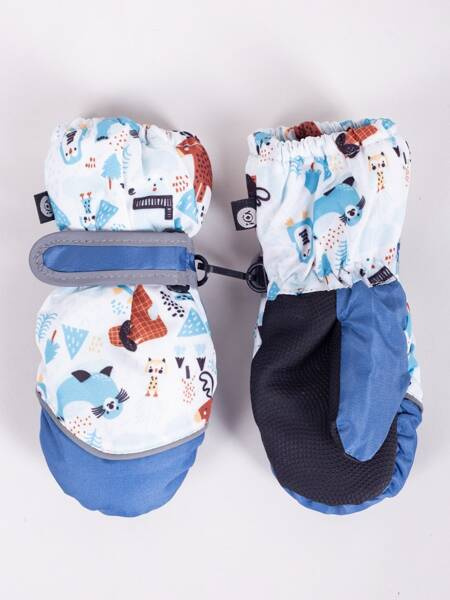 Narciarskie rękawiczki chłopięce w kolorze biało - niebieskim z motywem słodkich zwierzątek. Wnętrze rękawiczki wykończone miłym polarem.