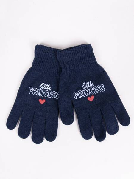 Praktyczne, dziewczęce rękawiczki w kolorze granatowym. Ozdobione czerwonym serduszkiem oraz napisem: little PRINCESS. Jednowarstwowe. Świetnie prezentują się na dłoniach.