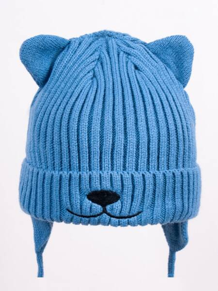 Zimowa czapka dla chłopca w kolorze ciemno – niebieskim. O regularnym, grubym splocie. Na górze znajdują się dwa uszka. Zakończona wywinięciem ze splotu ściągaczowego, na którym widnieje haftowany nosek misia. Trzywarstwowa – w środku posiada ocieplenie oraz bawełnianą podszewkę.