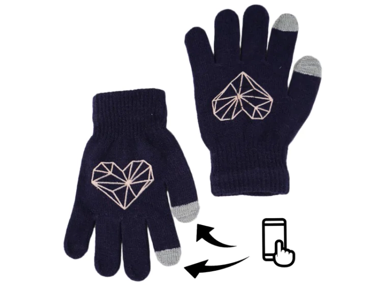 Rękawiczki pięciopalczaste z ABS. Dostępne w ofercie rękawiczki dziewczęce przeznaczone są dla dzieci w wieku mniej więcej 4 do 8 lat. Opcja dotykowa dla palca wskazującego i kciuka umożliwi dziecku korzystanie z urządzeń mobilnych bez konieczności zdejmowania rękawiczek.
