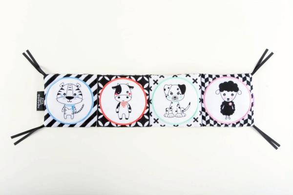 Książeczka GaGaGu ma kontrastowe kolory i wzory co stymuluje zmysł wzroku niemowlaka. Książeczka jest dwustronna. Z jednej strony są kontrastowe ilustracje zwierzaków z wyhaftowanymi elementami, które są wyczuwalnie inną teksturą dla dziecka pod paluszkami - stymulacja zmysłu dotyku, poznawanie różnych tekstur przez dziecko. Z drugiej strony są okrągłe pluszowe klapki umożliwiające dziecku zabawę w jedną z ulubionych ?gier? niemowlaka ? a ku ku! ? każda klapka jest zadrukowana dwustronnie w inny wzór ? jeden element, ale dwa zupełnie inne doznania wzrokowe. Pod pluszowymi klapkami z wizerunkami zwierzaków kryją się symbole jedzenia jakie dane zwierzątko je + pluszowe klapki mają wszyty szeleszczący materiał i przy otwieraniu i dotyku szeleszczą - młodsze dziecko poznaje różne kształty i kolory oraz otrzymuje stymulację słuchu, starsze dziecko uczy się jakie jedzenie spożywa dane zwierzę.