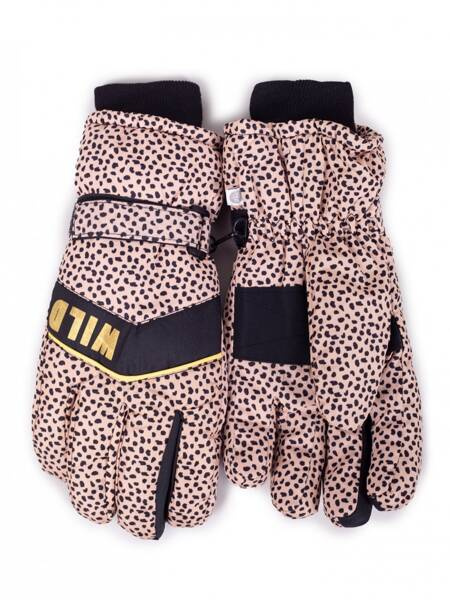 Narciarskie rękawiczki damskie w kolorze beżowym z motywem panterki. Ozdobione złotym napisem: WILD. Wnętrze rękawiczki wykończone miłym polarem.
