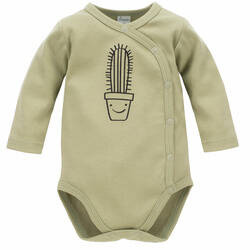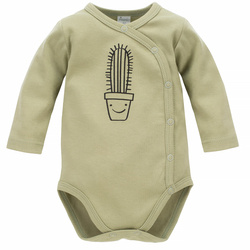 Body niemowlęce, rozpinane, z długim rękawem, w kolekcji Olivier uszyte zostało w 100% z delikatnej bawełny w modnym kolorze zieleni. Na przodzie umieszczono nadruk uśmiechniętego kaktusa nawiązujący do zabawnych motywów kolekcji. Nadruk wykonany jest bezpieczną metodą farb wodnych, odpornych na codzienne użytkowanie i pranie. Starannie dobrana, subtelna lamówka w kolorze ubranka sprawia, że produkt wygląda pięknie i świetnie się układa. Delikatne wykończenie kroku i rękawów sprawiają, że maluch czuje się w ubranku komfortowo i jednocześnie wygląda przepięknie. Body można rozpinać na całej długości na wygodne, bezniklowe zatrzaski, co bardzo ułatwia ubieranie i przewijanie maluszka. Ubranko będzie świetnie wyglądać z półśpiochami lub śpiochami z tej samej kolekcji. Body niemowlęce to niezbędny element wyprawki noworodka. Wyprodukowane jest w Polsce i posiada certyfikat „Bezpieczny dla dziecka".