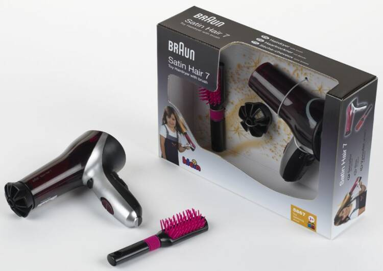 Suszarka powstała na licencji firmy Braun i dlatego wygląda jak prawdziwe urządzenie tej marki. Suszarka jest w kolorze czarnym z ciemno-różowymi oraz szarymi detalami. Posiada w zestawie miękką, wyprofilowaną szczotka oraz wymienną końcówkę. Suszarka po załączeniu baterii emituje cichy dźwięk działania silniczka oraz delikatnie dmucha chłodnym strumieniem powietrza. Zabawka została stworzona z myślą o dziewczynkach lubiących pielęgnowanie, suszenie i czesanie włosów. Zabawka jest nie tylko bezpieczna w użytkowaniu, ale sprawia również, że dziecko czuje się jakby korzystało z prawdziwej suszarki. Niemiecka firma Klein specjalizuje się w tworzeniu zabawek na licencji. Małe, plastikowe zabawki wyglądają niczym prawdziwe, elektroniczne urządzenia codziennego użytku.