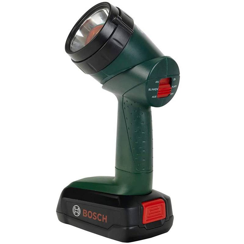 Kiedy mały majsterkowicz ciężko pracuje, potrzebuje dobrego światła i tu z pomocna z pewnością okaże się praktyczna, zasilana bateryjnie lampą Bosch. Głowicę lampy można regulować w zakresie do 90 stopni, dzięki czemu można ją wykorzystać do zapewnienia doskonałego oświetlenia każdego miejsca pracy. W zależności od zadania można nawet dostosować kolor światła: za pomocą pierścienia można zmienić światło z jasnobiałego na niebieskie, zielone lub czerwone.