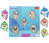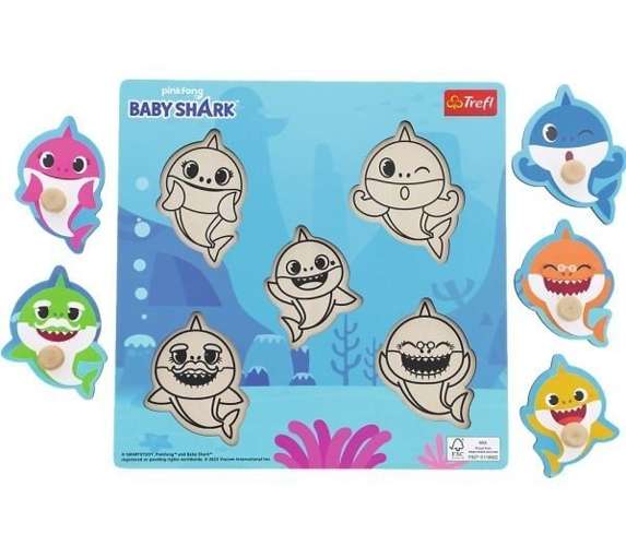 Puzzle drewniane na licencji Baby Shark - podstawka z wyżłobieniami oraz 5 wyjmowanych elementów z uchwytem.