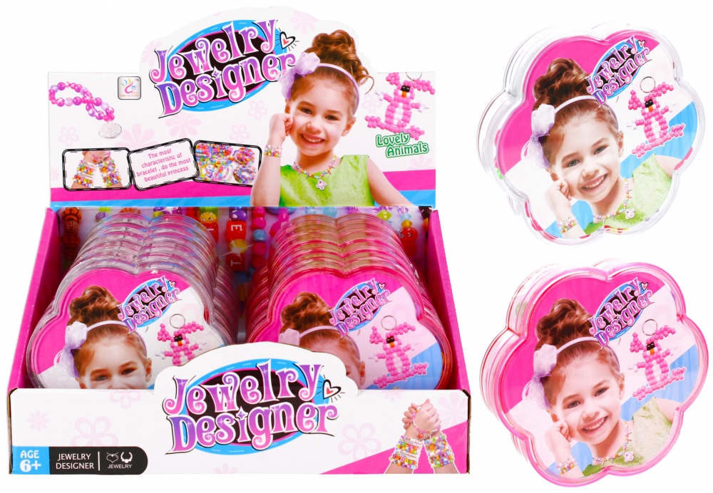 Zawartość zestawu: 5 różnych rodzaju koralików do nawlekania, ozdoby do nawlekania, żyłka do nawlekania. Całość wykonana z plastiku.