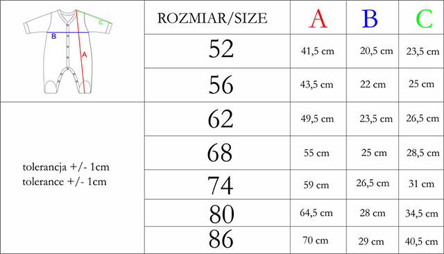 Zapinany wzdłuż całego ubranka na wygodne napy, by ułatwić przewijanie dziecka.