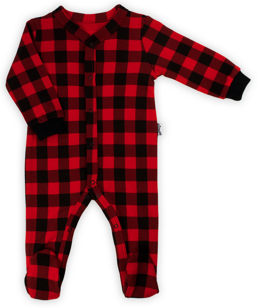 Mięciutki pajacyk z długim rękawem w kratkę czarno-czerwoną, zakończonym ściągaczem i stópkami.