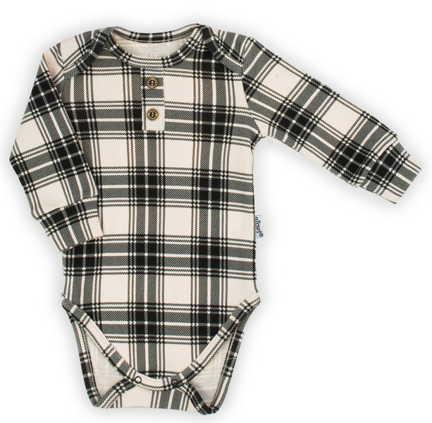 Body polo z długim rękawem, uszyte z bawełny w kratkę beżowo-czarną, posiadającą certyfikat Oeko-Tex Standard 100 Tekstylia godne zaufania.