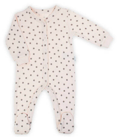Mięciutki kremowy pajacyk w kolorze jasnego łososiu w grafitowe groszki. Zdecydowanie must have każdego rodzica. Zapinany wzdłuż całego ubranka na wygodne bezniklowe napy, by ułatwić przewijanie dziecka. Uszyty z bawełny wysokiej jakości posiadającej certyfikat Oeko-Tex Standard 100 Tekstylia godne zaufania.
