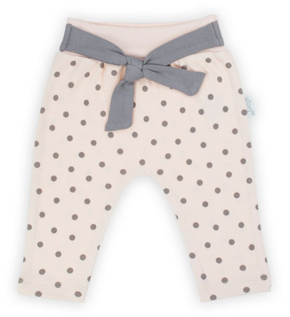 Nie krępujące ruchów, wygodne spodnie dla dziewczynki, uszyte z delikatnej łososiowej bawełny w grafitowe groszki. Ubranko w pasie posiada gumkę od roz. 68. Spodnie zdobi grafitowy pas wiązany na przodzie. Wysoka jakość produktu została potwierdzona certyfikatem Oeko-Tex Standard 100 Tekstylia godne zaufania.