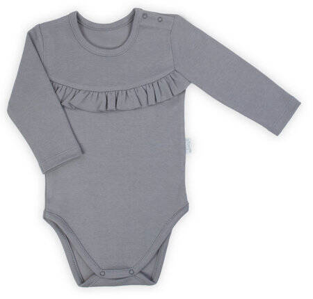 Body z długim rękawem dla dziewczynki, uszyte z grafitowej bawełny z niewielką ilością elastanu. Materiał posiada certyfikat Oeko-Tex Standard 100 Tekstylia godne zaufania. Body ozdobione zostało marszczoną falbanką na przodzie. Zapinane na wygodne bezniklowe napy na ramieniu i w kroku.