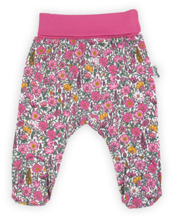 Wygodne i miękkie półśpioszki uszye z drukowanej bawełny, przedstawiającej piękną kolorową łąkę. Wysoka jakość materiału została potwierdzona certyfikatem Oeko-Tex Standard 100 Tekstylia godne zaufania. Półśpioszki mają luźny fason i lekko obniżony stan by pomieścić pieluszkę, posiadają szeroki, bezuciskowy różowy ściągacz w pasie zapewniający pełny komfort maluszkowi.