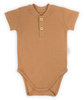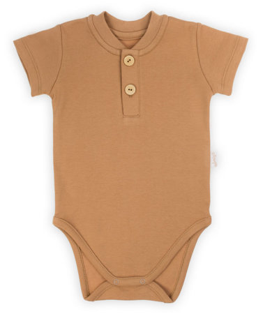 Body polo z krótkim rękawem dla chłopca, idealne w ciepłe dni, uszyte z karmelowej 100% bawełny.Materiał posiada certyfikat Oeko-Tex Standard 100 Tekstylia godne zaufania. Produkt zapinany na przodzie na drewniane guziczki, natomiast w kroku na bezniklowe napy, zapewniając konfort przy ubieraniu.
