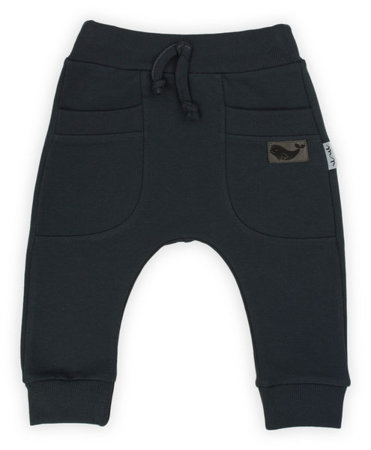 Modne spodnie typu baggy dla chłopca wykonane z grafitowej bawełny dresowej z niewielką ilością elastanu.Materiał posiada certyfikat Oeko-Tex Standard 100 Tekstylia godne zaufania.Fason spodni jest wygodny, zdobią go ciekawe kieszonki oraz doszyty sznureczek w kolorze spodni.Pas nogawki oraz kieszonki wykończone zostały ściągaczem. Na jednej z kieszonek naszyta jest naszywka z wielorybem.