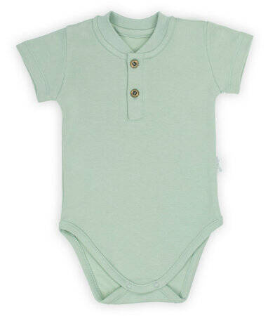 Body z krótkim rękawem dla chłopca, uszyte z oliwkowej 100% bawełny. Materiał posiada certyfikat Oeko-Tex Standard 100 Tekstylia godne zaufania. Produkt na przodzie zdobi zapięcie typu polo, zapinane na dwa guziczki. W dole zapinane na bezniklowe napy.