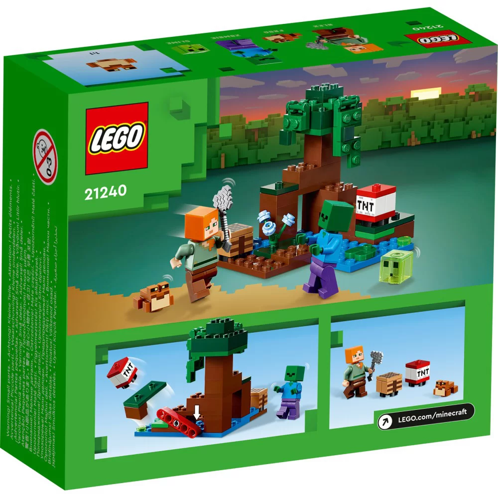 Podaruj dziecku kreatywny dreszczyk emocji dzięki modelowi niebezpiecznego biomu mokradeł. Ta wszechstronna zabawka zawiera znaną postać, Alex, która podróżuje przez błoto i bagna. Możliwości kreatywnego budowania poszerzają dwa wrogie moby, które trzeba zwalczyć – zombie i szlam – a także przyjazna żabka, która obserwuje akcję z lilii wodnej. Dzieci pomagają Alex, używając topora i obsługując dźwignię do detonacji dynamitu, aby odeprzeć ataki. Dodatkową cyfrową zabawę zapewnia aplikacja LEGO Builder, w której można powiększać i obracać model, aby zwizualizować go podczas budowania.